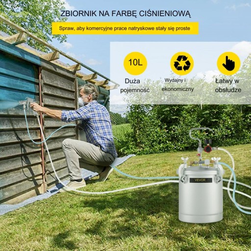 Zbiornik o pojemności 10 litrów umożliwia długotrwałe malowanie bez konieczności częstego napełniania. Wykonany z litej stali węglowej, jest odporny na rdzę, korozję i łatwy do czyszczenia, co sprawia, że nadaje się do dużych projektów i zastosowań przemysłowych.