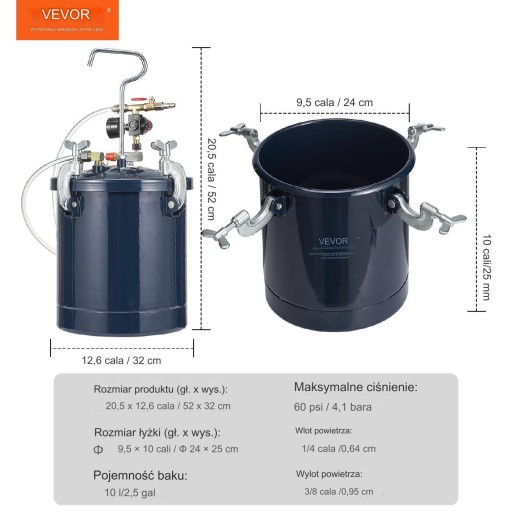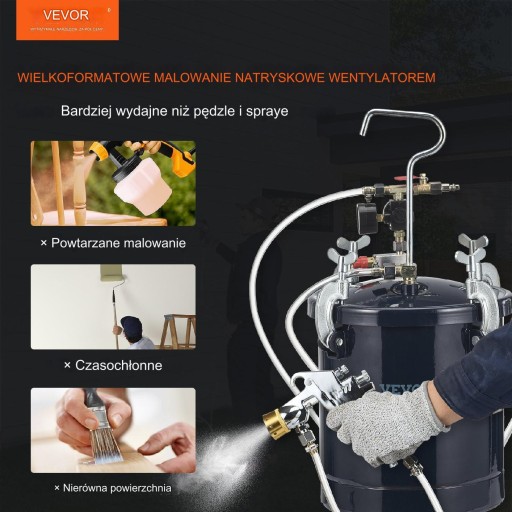 Zbiornik na farbę zawiera dwa pistolety natryskowe z dyszami 1,5 mm i 4 mm, co eliminuje konieczność zakupu dodatkowego sprzętu. Nadaje się do farb lateksowych i metalicznych, z możliwością dopasowania dyszy do wielkości cząstek, co zapobiega zatykaniu. Trzy pokrętła pozwalają na regulację przepływu powietrza, farby i szerokości natrysku, zapewniając równomierną atomizację.