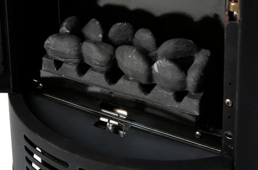 Za półokrągłymi szklanymi drzwiczkami znajduje się ozdobny węgiel. W połączeniu z czerwonym kolorem płomieni sprawia to wrażenie siedzenia przy kominku.