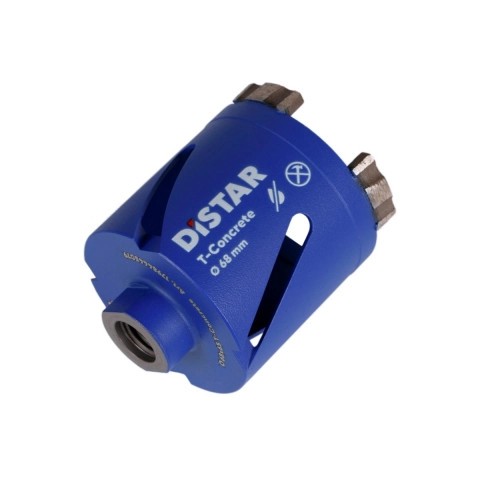 Wiertła diamentowe segmentowe Distar DDS-W T-Beton przeznaczone są do wiercenia głuchych otworów pod gniazdka w ścianach murowanych, ze zbrojonego i słabo zbrojonego betonu bez użycia chłodziwa. Wiertła są produkowane o średnicach 68, 72, 82. CACC mają wewnętrzne gwintowane osadzające M16 i dodatkowo mogą być wyposażone w centrujące wiertło z węglika spiekanego z adapterem M16/SDS Plus (do mocowania wiertła w uchwycie perforatora).W celu zwiększenia wydajności wiertła i wykluczenia powstawania pyłu podczas wiercenia otworów zaleca się użycie specjalnego adaptera, który dostarcza wodę do obszaru roboczego dla skutecznego usuwania osadów.Wiertła diamentowe, w przeciwieństwie do koron z elementami tnącymi z węglików spiekanych, są surowo zabronione przy pracy w trybie uderzeniowym.