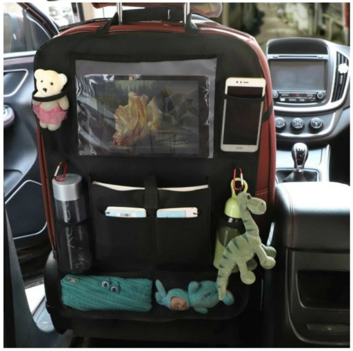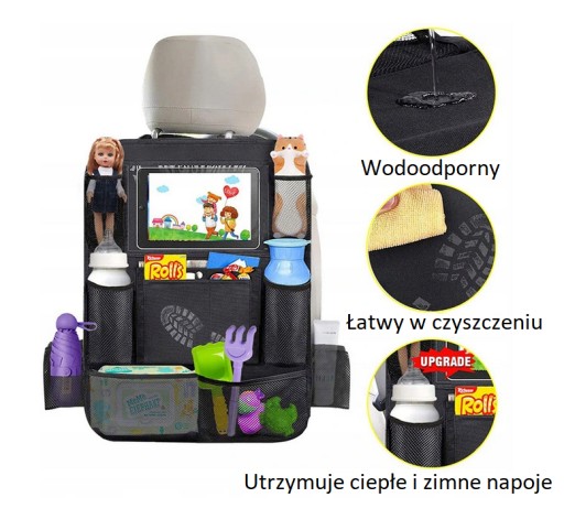 Rozmiar » 44x63cm | Kieszeń na tablet z ekranem dotykowym | 7 pojemnych kieszonek | Montaż » tylnia część przedniego siedzenia |