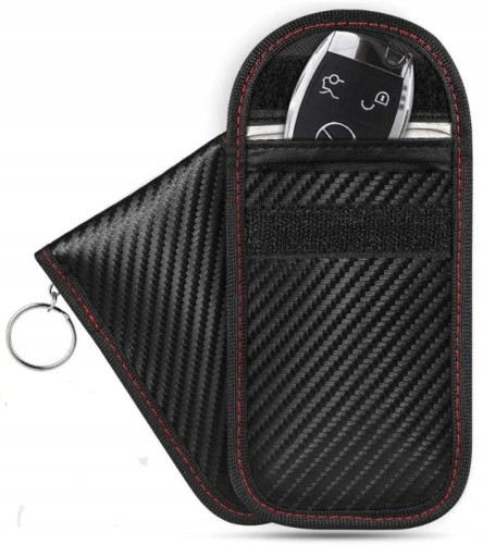 BLOKADA FAL RFID, SYSTEMU KEYLESS W WERSJI CARBON Prezentujemy zabezpieczenie przed kradzieżą samochodu na tzw. walizkę. Polega ona na zeskanowaniu kodu kluczyka i uaktywnieniu go w odpowiednim momencie. Dzięki specjalnej powłoce wykorzystanej w pokrowcu, sygnał kluczyka SMART KEYLESS GO nie jest emitowany poza etui, dzięki czemu nie może zostać przechwycony. Instrukcja: przedmiot chroniony należy umieścić w kieszeni obszytej srebrno szarym materiałem. Na zdjęciu (po lewej) cześć oznaczona strzałkami Druga kieszeń nie zapewnia ochrony lecz stanowi dodatkowe miejsce np na prawo jazdy, klucze od domu itp. Dodatkowo dzięki etui kluczyk jest chroniony przed uszkodzeniem przy upadku, rysami i kurzem. Etui jest kompaktowych rozmiarów EDYCJA SPECJALNA CARBON z obszyciem kontrastową czerwoną nicią.