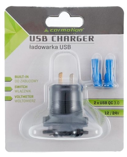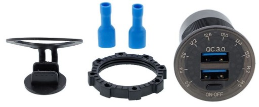 - Ładowarka USB, wyposażona w 2xUSB Quick Charge 3.0, włącznik i woltomierz.