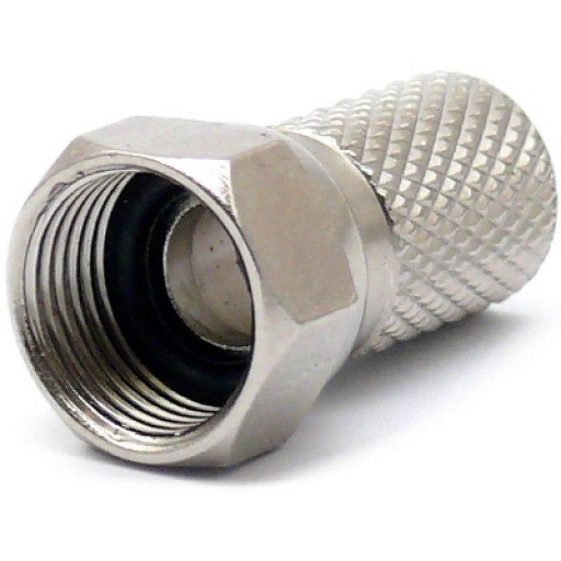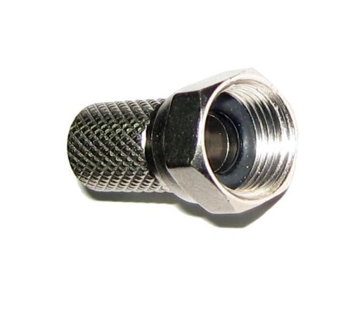 - Ostatnim krokiem jest wkręcenie wtyku F na kabel. Najpierw należy go wepchnąć, a potem zdecydowanymi ruchami wkręcić. Przy prawidłowo obrobionej końcówce kabla, wtyk powinien wejść na niego tak głęboko, aż niewielki fragment dielektryka (około 1mm) przeciśnie się przez otworek we wtyku. Żyła powinna wystawać prosto, nie na skos, nie powinien też do niej dotykać ekran ani oplot. Gwint wewnątrz wtyku zapewnia kontakt elektryczny oplotu ze złączem.