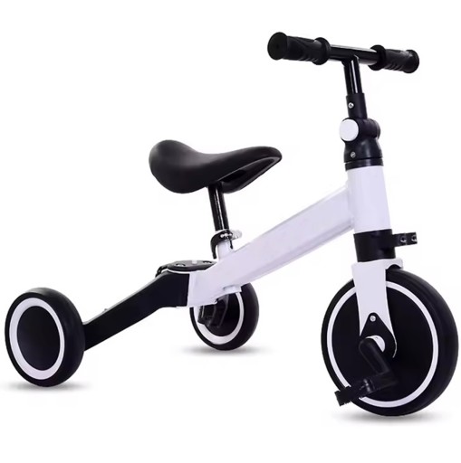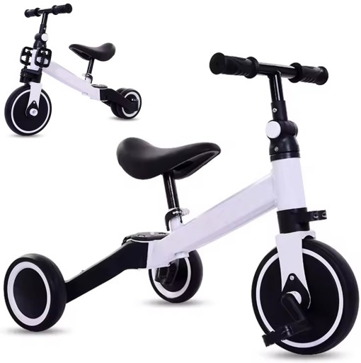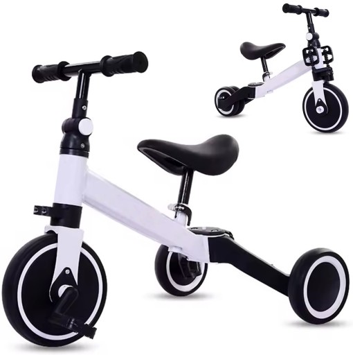 Solidna i uniwersalna konstrukcja, którą można łatwo dostosować do wieku i umiejętności dziecka. Możliwość złożenia tylnych kółek oraz złożenia i rozłożenia tylnych pedałów pozwala łatwo przekształcić rowerek w jeździk. Wygodne, miękkie siodełko posiada regulację wysokości, zaś kierownica została pokryta materiałem antypoślizgowym. Wszystkie koła posiadają warstwę z pianki EVA, która zapobiega rysowaniu powierzchni oraz lekko amortyzuje podczas jazdy. Możliwość błyskawicznego złożenia ramy ułatwia transport i przenoszenie rowerka.