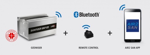 Dopełnieniem urządzenia AIR2 SAN jest bezpłatna aplikacja, dostępna na smartfony z systemem iOS oraz Android. Dzięki aplikacji można śledzić krok po kroku postęp przeprowadzanego ozonowania, sprawdzić listę wykonanych dezynfekcji i co ważne, wygenerować raport w postaci pliku PDF, który po wydrukowaniu może być poświadczeniem prawidłowo przeprowadzonego ozonowania pojazdu.