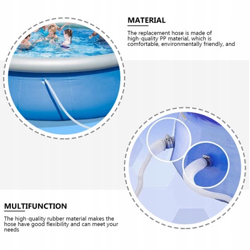 Ten produkt to praktyczny wąż zamienny do pompy basenowej, wykonany z materiału PP, wygodny i przyjazny dla środowiska, o dobrej teksturze, odpowiedni do wymiany węża basenowego wewnątrz i na zewnątrz. Elastyczność i zdolność adaptacji tego węża są bardzo dobre i można go dowolnie wydłużać i zwijać. Jest to bardzo praktyczny dodatek do basenu.