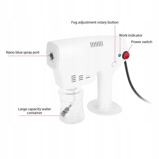 Specyfikacja: Stan: 100% nowy! Typ artykułu: Nano pistolet parowy Kolor biały Materiał: tworzywo sztuczne; Pojemność zbiornika na wodę: 300 ml Moc: 1200 w Typ wtyczki: wtyczka EU (220 v) Napięcie: 220 v Objętość powietrza: 20/min