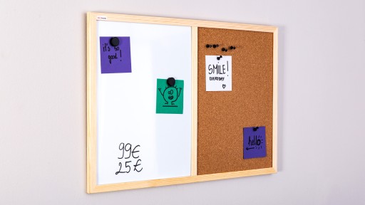 - Funkcjonalność i wygoda?- dzięki różnym powierzchniom, tablica zyskuje funkcjonalność kilku tablic. Tablica korkowa pozwala przypinać do niej pinezki lub igły.?Tablica magnetyczna biała pozwala na pisanie po niej markerami oraz wykorzystywanie magnesów, tak by móc wyeksponować ważne informację, notatki czy też zdjęcia.