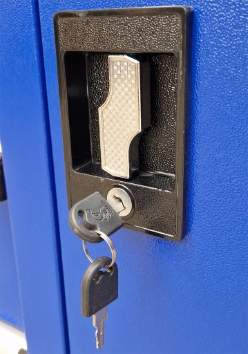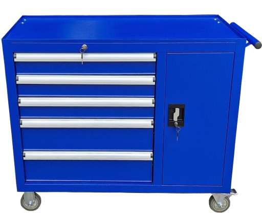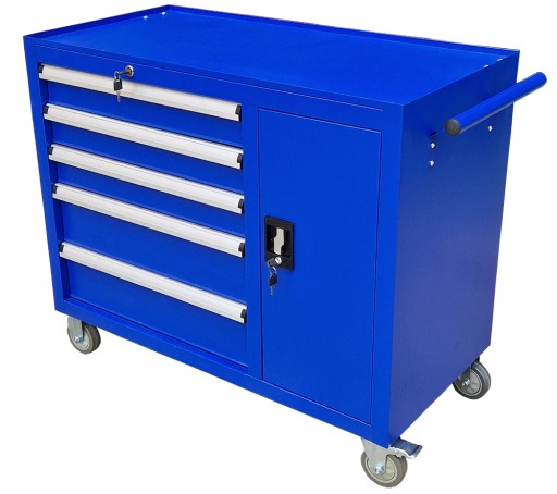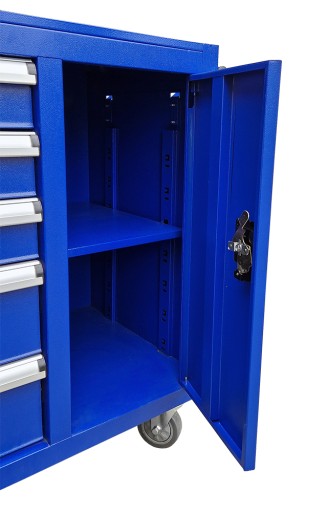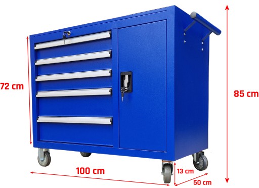 - Szafka pozwala zachować porządek w pracy i zabezpieczyć narzędzia przed kradzieżą (blokada wózka). Wózek posiada ergonomiczny uchwyt wbudowany w blat, a szuflady na łożyskach kulkowych są w pełni wysuwalne. Szafka została wyposażona w 2 komplety kluczy do zamka centralnego oraz bocznej szafki.