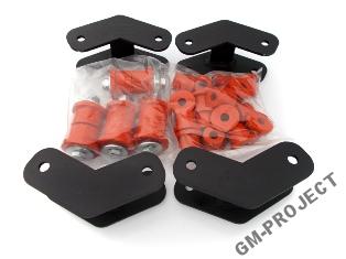Zestaw przedłużanych o 2" wieszaków resorów do Suzuki Samurai służących do podniesienia samochodu + zestaw tulei poliuretanowych (polibuszy).Jest to najtańszy sposób z możliwych, aby podnieść swoje auto - wieszaki są dłuższe o 2" (5cm) od oryginalnych - jest to optymalna długość, przy której samochód można bezpiecznie i pewnie prowadzić, nie zmieniając geometrii zawieszenia. W zestawie komplet tulei resorów i wieszaków wykonanych z poliuretanu - materiału kilkukrotnie wytrzymalszego niż guma stosowana w standardowych tulejach.Wieszaki wraz z polibuszami pasują do wszystkich wersji Suzuki Samuraia, Santana, SJ410, SJ413 z resorami.
