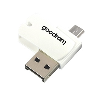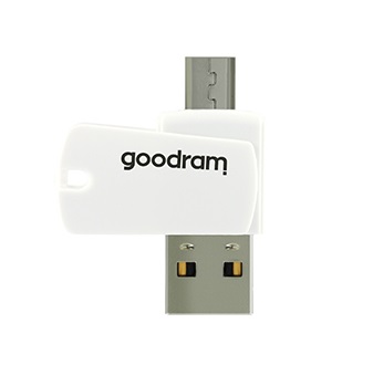 Kompaktowy czytnik kart pamięci GOODRAM został wyposażony w złącza USB typu A oraz micro B. Dzięki temu urządzeniu wykorzystasz kartę micro SD/SDHC jako przenośną pamięć USB. Jest to niewielki, poręczny gadżet, który swobodnie zmieści się w każdej kieszeni i umożliwi szybki transfer plików pomiędzy różnymi urządzeniami, takimi jak komputery, tablety, smartfony, kamery czy aparaty fotograficzne. Dodatkowo, obudowa czytnika posiada niewielką perforację, co ułatwia przymocowanie go do kluczy lub breloka.