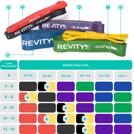 ✅ ŁATWOŚĆ DOBORU ĆWICZEŃ - Na każdej z gum znajduje się nasze logo oraz wartość oporu wraz ze skalą.