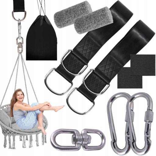 - ✅Łatwy montaż – zestaw montażowy do hamaka czy huśtawki umożliwia szybkie ich zawieszenie, bez konieczności wiercenia czy uszkadzania drzewa, a także bez potrzeby używania dodatkowych narzędzi