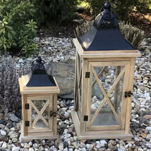 Wykonane są z drewna w odcieniach brązu, przecierane w celu stylizacji. Daszki wykonane z metalu w kolorze brązowym. Oba lampiony posiadają otwierane daszki mocowane na zawiasach. Dzięki uchwytom w górnej części mogą być zawieszone. Komplet dwóch lampionów: