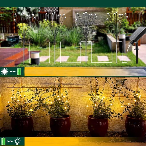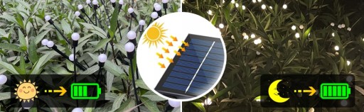 8 trybów oświetlenia: Za pomocą pilota można regulować 8 trybów migania. Różne kombinacje efektów świetlnych tworzą magiczną atmosferę. Solar Firefly Lights automatycznie włącza się w nocy i wyłącza w ciągu dnia. Solar Firefly Lights są wyposażone w akumulator o bardzo dużej pojemności 1200 mAh, który jest w stanie zapewnić 8-12 godzin ciągłego oświetlenia po 4-6 godzinach pełnego naładowania.