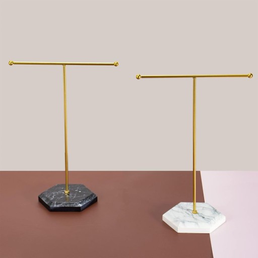 Ten produkt ma stojak w kształcie litery T, na którym możesz powiesić swoją ulubioną biżuterię i akcesoria Złoty pręt zapewnia nowe wrażenia wizualne.