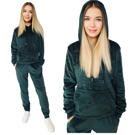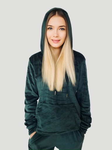 ✅ MODNY DESIGN – elegancki komplet welurowy w stylowym ciemnozielonym kolorze z kapturem, idealny na różne okazje.