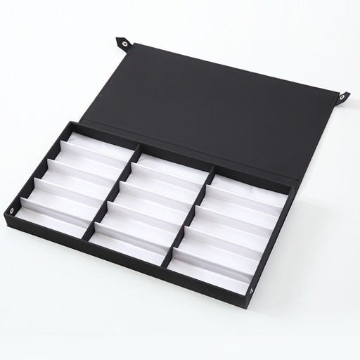 1. 15 siatek: Pudełko wystawowe może pomieścić do 15 par okularów, co pomaga w organizowaniu i zabezpieczeniu okularów, ułatwiając zarządzanie nimi i ich znajdowanie.
