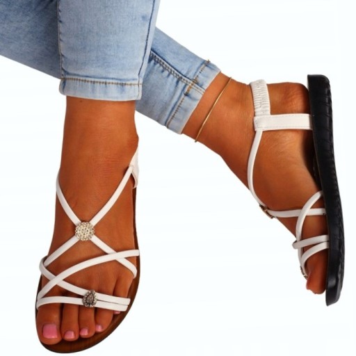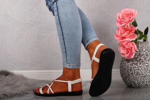 Damskie sandałki w kolorze białym na płaskim spodzie. Idealnie sprawdzą się jako obuwie na co dzień w letnie, upalne dni. Prosty fason dopasuje się również do eleganckich stylizacji a ozdobne koraliki dodadzą uroku każdej stylizacji. Elastyczny pasek przy pięcie ułatwia zakładanie obuwia i ułatwia jego dopasowanie do stopy.