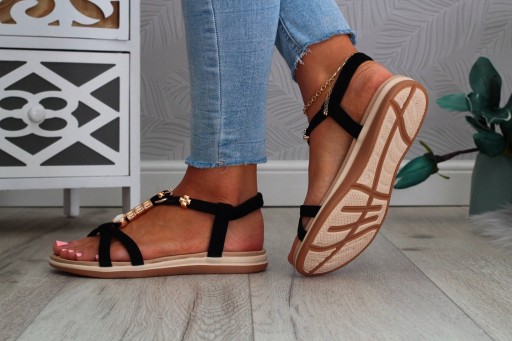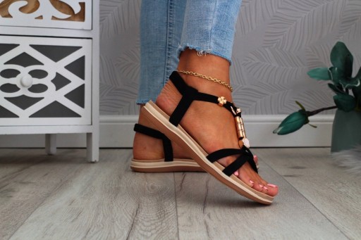 Damskie sandałki w kolorze czarnym na płaskim spodzie. Idealnie sprawdzą się jako obuwie na co dzień w letnie, upalne dni. Prosty fason dopasuje się również do eleganckich stylizacji, a ozdobne koraliki dodadzą uroku niejednej stylizacji. Elastyczny pasek przy pięcie ułatwia zakładanie obuwia i ułatwia jego dopasowanie do stopy.