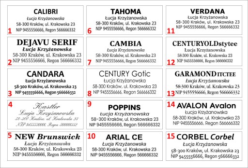 - MOŻNA WYBRAĆ CZCIONKĘ - można wybrać z naszych propozycji dołączonych do aukcji. Wystarczy podać nr czcionki. Jeżeli nie otrzymamy żadnych wytycznych dot. wyglądu pieczątki to pieczątkę wykonamy czcionką calibri.