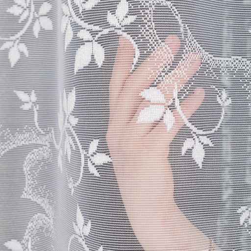Biała firana żakardowa. Szerokość przed zmarszczeniem, wysokość w najdłuższym miejscu. W tym modelu nie ma możliwości zmiany szerokości.
