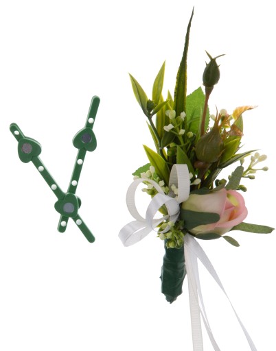 Oferta przedstawia zieloną przypinkę na magnez. Magnesy zapewniają stabilne przymocowanie butonierki . Przypinka niezbędna w branży florystycznej ślubnej.