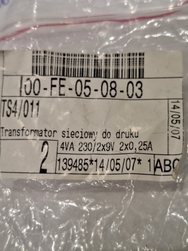 Na aukcję wystawiam transformator sieciowy do druku Indel TS 4/011 4VA 230/2x9V 2x0,22A