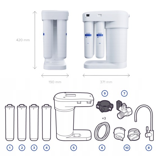 - Doskonała jakość wody: Usuwa 99,9% zanieczyszczeń, metale ciężkie, bakterie i wirusy.