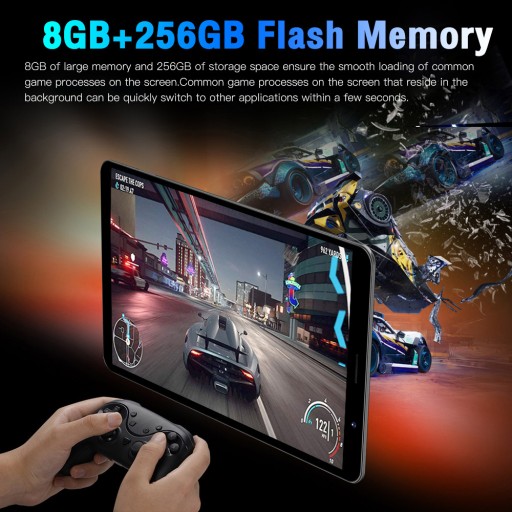 Wyjątkową szybkość tabletu przypisuje się ultraszybkiemu 8-rdzeniowemu procesorowi SC9863 1.6GHz, w połączeniu z 8 GB pamięci RAM, 256 GB pamięci ROM, może uruchamiać wiele aplikacji jednocześnie, nie utknie, może obsługiwać najnowsze gry i multimedia o wysokiej jakości.