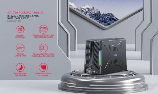 Kieszeń dokująca SATA/PCIe M.2 Zasilacz 12V 2A, Kabel USB-C/USB-Co długości 100cm, Instrukcja obsługi