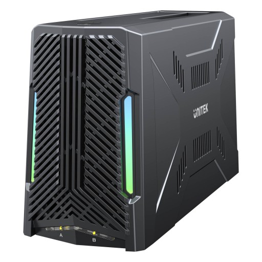 Stwórz nowoczesne stanowisko gracza – kieszeń na dyski M.2 i SATA Unitek świetnie prezentuje się na biurku w towarzystwie klawiatury i słuchawek gamingowych. Światło diod LED RGB na obudowie urządzenia pełni nie tylko funkcję ozdobną, lecz również informacyjną. Informują o podłączonym zasilaniu oraz o tym, który dysk jest aktualnie zajęty.