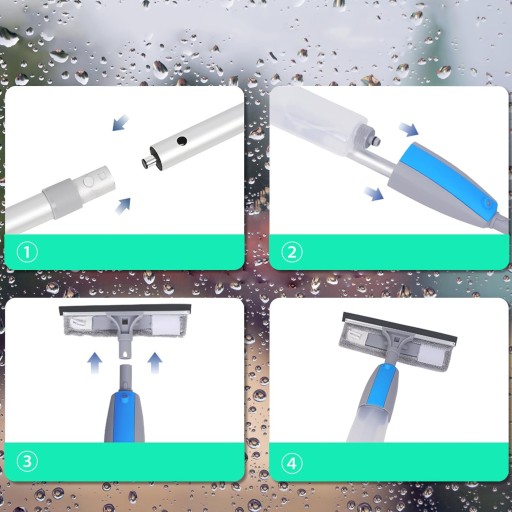Myjka do okien jest dostarczana z butelką na wodę, którą można napełnić wodą lub roztworem czyszczącym i rozpylić na szybę. Uporczywe plamy na szkle można łatwo wyczyścić ściereczką z mikrofibry, a na koniec można użyć skrobaka do szkła, aby usunąć plamy i wilgoć ze szkła, dzięki czemu cały proces czyszczenia okien jest prosty i przyjemny.