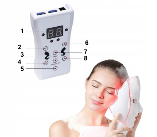 2️⃣ Podłączenie maski oraz wybór terapii: Podłącz maskę LED do źródła zasilania. Wybierz żądany tryb terapii światłem oraz kolor światła, który najlepiej odpowiada Twoim potrzebom. Możesz wybrać spośród 7 różnych kolorów światła, zgodnie z opisanymi właściwościami każdego z nich.
