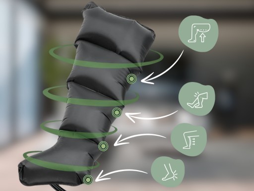 - B: Stymulujący przepływ limfy – komory mankietów napełniają się stopniowo od stóp do ud. Kolejność napełniania zapobiega cofaniu się limfy w kierunku stóp.