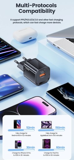 • Szybkie ładowanie: Dzięki Qualcomm Quick Charge i PD3.0/QC3.0 ta ładowarka może szybko naładować Twój telefon komórkowy.