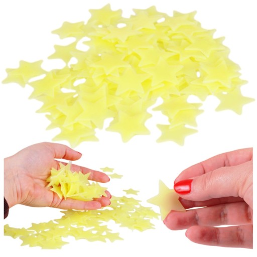 Zestaw 100 fluorescencyjnych gwiazdek, które pochłaniają światło emitowane przez słońce lub światło sztuczne, a dzięki temu świecą w ciemnościach.