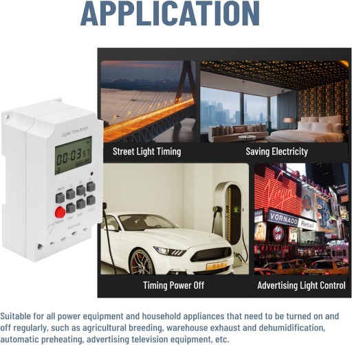 【Szerokie zastosowanie】 Cyfrowy wyłącznik czasowy ma szeroki zakres zastosowań: sterowanie obiektami, takimi jak latarnie uliczne, neony, znaki reklamowe, urządzenia produkcyjne