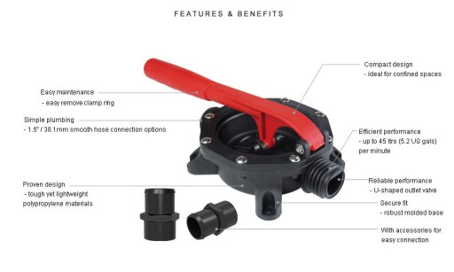 Do montażu na grodzi lub pokładzie. Jest to dobra ręczna pompa zęzowa dla małych i średnich łodzi. Lekka i wytrzymała, łatwa dźwignia umożliwia szybkie pompowanie. Łatwa w użyciu i konserwacji, membrana jest szybko dostępna w celu usunięcia zanieczyszczeń.