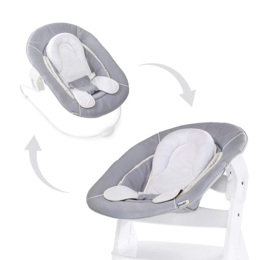 MOCOWANIE DO BUJAKA I KRZESEŁKA W JEDNYM: wielofunkcyjnego leżaczka z 3-punktowymi pasami można używać na dołączonej ramie bujaka lub jako fotelik dla noworodka na drewnianym krzesełku Alpha+