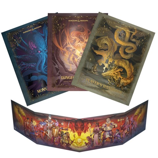 Zestaw zawierający trzy podstawowe podręczniki do Dungeons & Dragons RPG - Player's Handbook, Dungeon Master's Guide, Monster Manual oraz ekran mistrza gry.