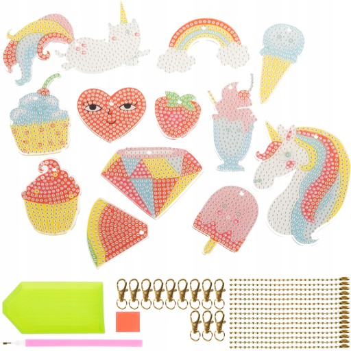 - 12 plastikowych wzorów (serce, truskawka, 2x lód, , 2x babeczka, diament, arbuz, tęcza, jednorożec, kotek, pucharek lodowy)