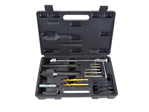 Profesjonalny zestaw do demontażu urwanych świec żarowych i naprawy gwintu. Zestaw pozwala na demontaż świec żarowych o gwincie M8 oraz M10. Naprawę można przeprowadzić bez konieczności demontażu głowicy – w takim przypadku w miejscu odpowiedniego wtryskiwacza należy zamontować adapter pneumatyczny. Sprężone powietrze uniemożliwi przedostanie się pozostałości po obróbce do komory spalania. Charakterystyka produktu możliwość przeprowadzenia naprawy bez konieczności zdejmowania głowicy przystosowany do świec żarowych o gwincie M8 oraz M10 całość zestawu umieszczono w poręcznej walizce z tworzywa sztucznego Zawartość zestawu wykrętak do bardzo mocno osadzonych świec żarowych 3 gwintowniki: M8 x 1.0, M10 x 1.0 oraz 6.3 mm (1/4") - 28UNF pokrętło do gwintowania z funkcją grzechotki 2 wiertła stopniowe: 7 x 5,5 mm oraz 9 x 5,5 mm uchwyt wiertła 2x wiertło 3,5mm 2x kołek o wymiarach 6 x 3,5 x 40 mm nasadka E10 wrzeciono 12 mm hex nakrętka 30 mm hex narzędzie centrujące
