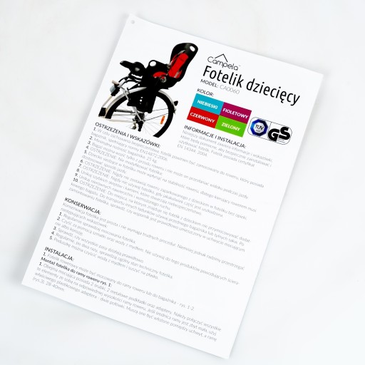 Szybki montaż Mocowanie fotelika do ramy roweru. Mocowanie fotelika do bagażnika. Obejma mocująca. Należy połączyć wszystkie te elementy ze sobą na odpowiedniej wysokości ramy roweru. Jeśli średnica ramy jest zbyt mała, użyj właściwego plastikowego adaptera (dwie połówki). Połączyć siedzisko z metalowym masztem. Wsuń metalowy maszt do obejmy mocującej, tak aby zatrzask odpowiednio się zrównał względem rury. Po połączeniu metalowego masztu i klamry zatrzask należy wcisnąć. Dostosuj odpowiednią wysokość fotelika (od 1,5 do 2 cm dla amortyzacji). Przełożyć śruby przez otwory. Dwie metalowe podkładki należy dokręcić śrubami od spodu fotelika. Połącz fotelik ze sztycą siodła. Po zamontowaniu fotelika posadź w nim dziecko, w celu dopasowania rozmiaru i wysokości pasów bezpieczeństwa (długość pasów można regulować). Regulacji podnóżków (wysokość można regulować). Wszystkie dodatkowe informacje (ostrzeżenia, wskazówki, konserwacja, instalacja) znajdują się w instrukcji obsługi dołączonej do fotelika.