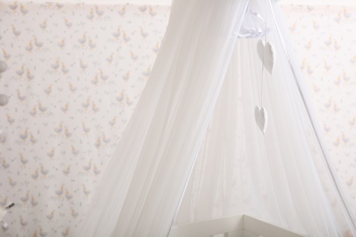 Tkanina to przewiewny szyfon. Moskitiera osłania dziecko od otoczenia i pozwala na spokojny odpoczynek. Jako jedna z niewielu ma możliwość osłonięcia otworu w kole wspornika. Dzięki temu powstaje piękna "róża" tworząca ciekawy element ozdobny i skupiająca uwagę leżącego maluszka.