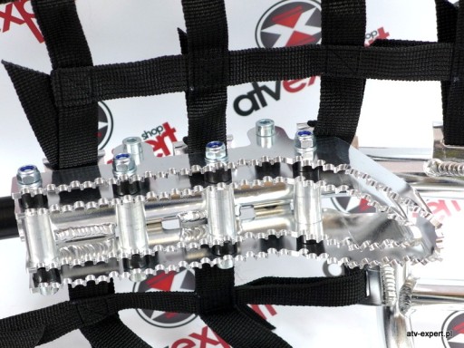 - Podwójne podnóżki zapobiegają ślizganiu się butów, dodatkowo tulejki mocujące niwelują wibracje