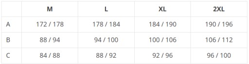 A - wzrost | B - obwód klatki piersiowej | C - obwód bioder