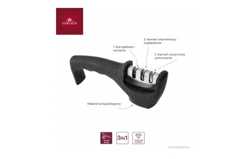 Praktyczna trójfazowa ostrzałka GRANITEX doskonale sprawdzi się przy nożach z gładkimi ostrzami ze stali nierdzewnej. Jej rękojeść została wykonana z przyjemnego w dotyku tworzywa o satynowym wykończeniu, a przy podstawie wykorzystano antypoślizgowy materiał, zapewniający bezpieczeństwo podczas użytkowania. Uwaga, ostrzałki GERLACH GRANITEX 3 w 1 nie należy myć w zmywarce.