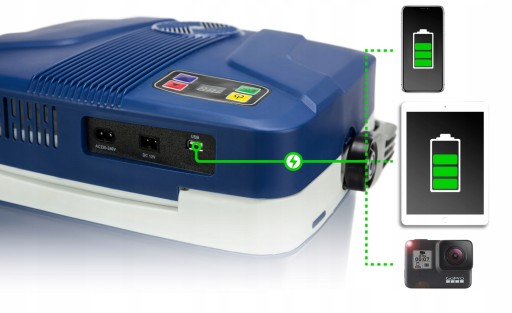 Wbudowany port USB umożliwia ładowanie urządzeń bez konieczności odłączania lodówki od gniazda zapalniczki samochodowej